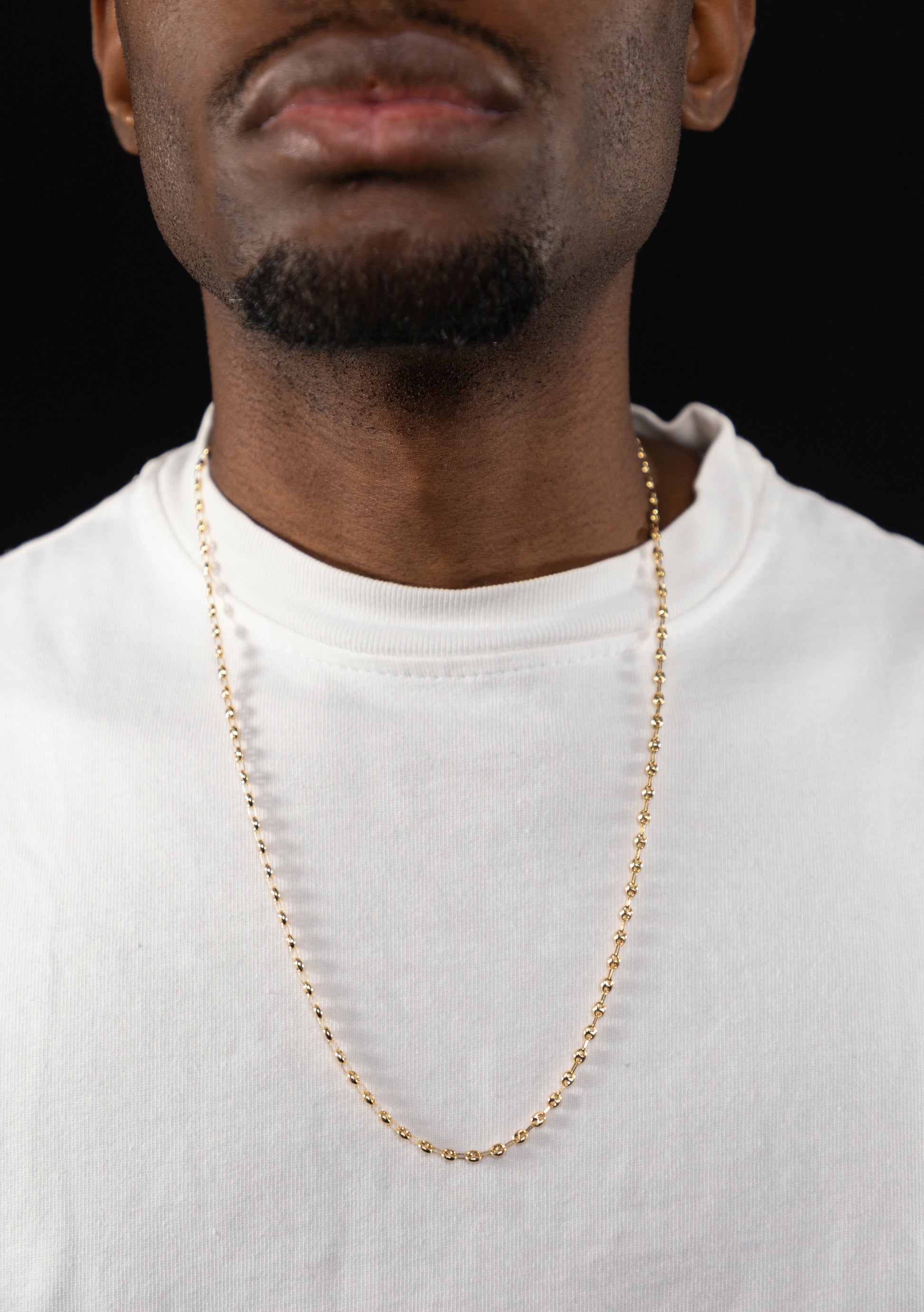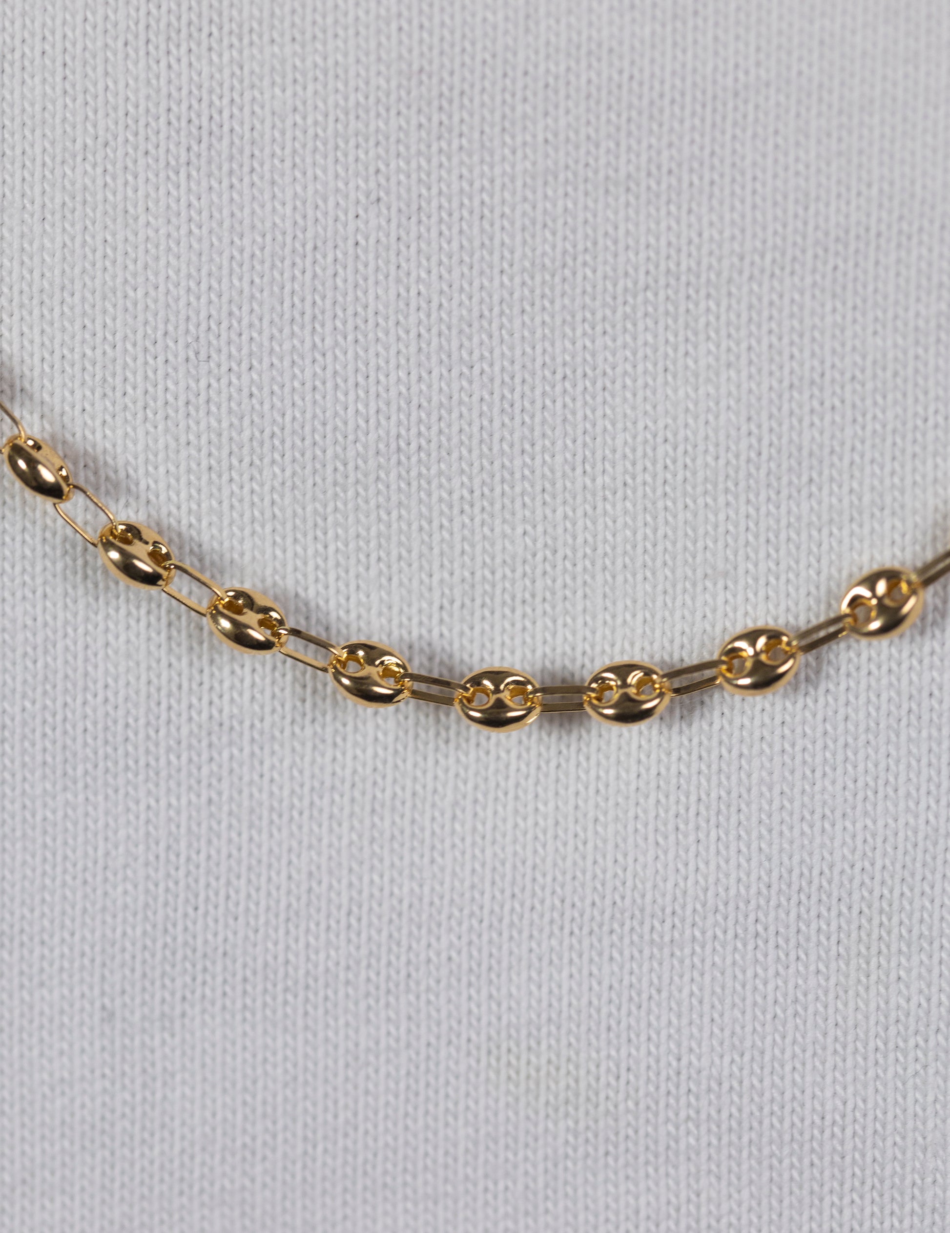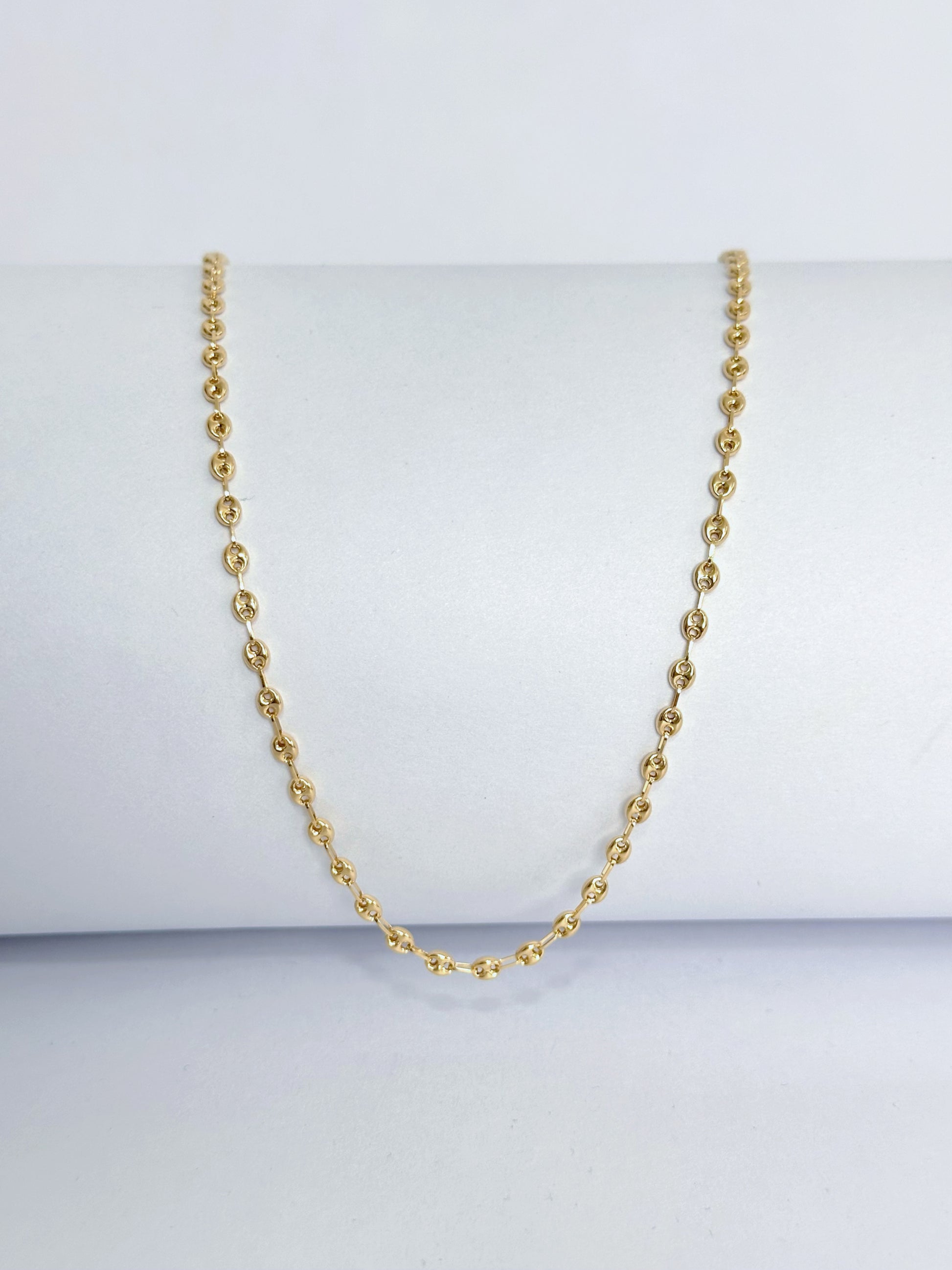Esta cadena de eslabones en oro 18k combina elegancia y durabilidad, ideal para quienes buscan una pieza sofisticada y resistente. Su diseño clásico resalta el brillo natural del oro, aportando un toque de distinción a cualquier atuendo. Perfecta para uso diario o ocasiones especiales, garantiza una inversión en calidad y estilo atemporal.