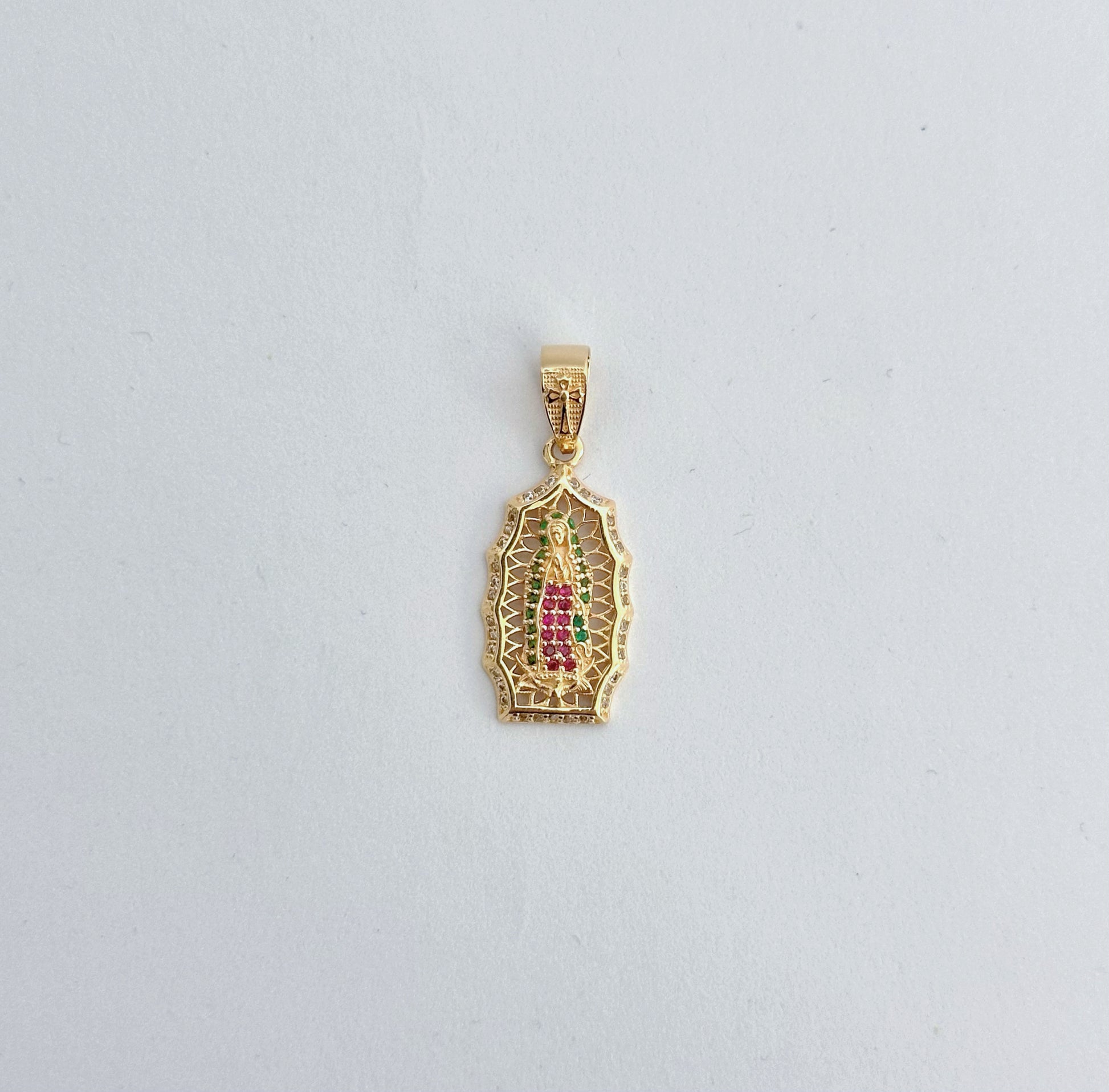 Este dije de la Virgen de Guadalupe, elaborado en oro de 18 quilates, combina tradición y elegancia.