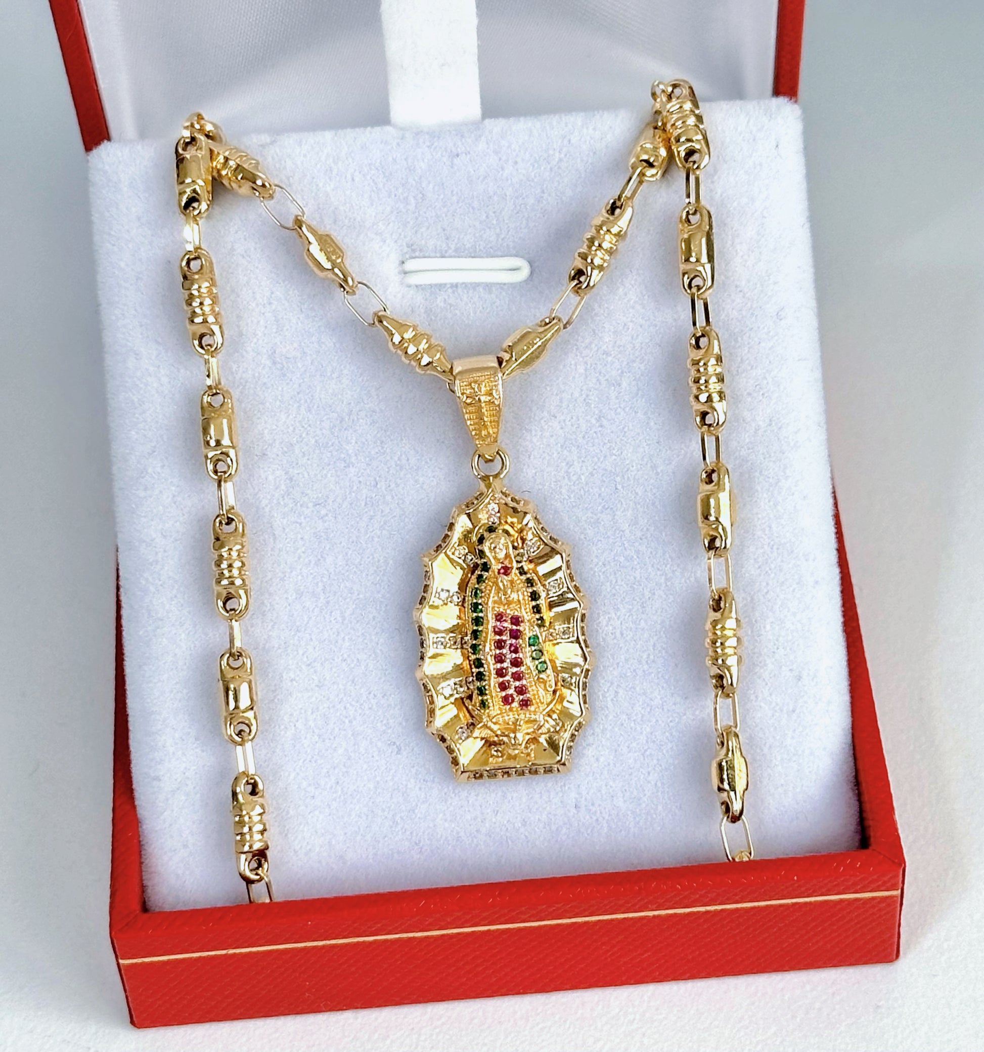 Este set combina una cadena rústica con un dije de la Virgen de Guadalupe, ambos fabricados en oro de 18 quilates. La cadena rústica ofrece un acabado texturizado que aporta carácter y autenticidad, mientras que el dije representa un símbolo de fe y protección con detalles finamente trabajados. Ideal para quienes buscan una pieza que une tradición y estilo, este conjunto destaca por su calidad y diseño exclusivo, perfecto para uso diario o como un regalo significativo.