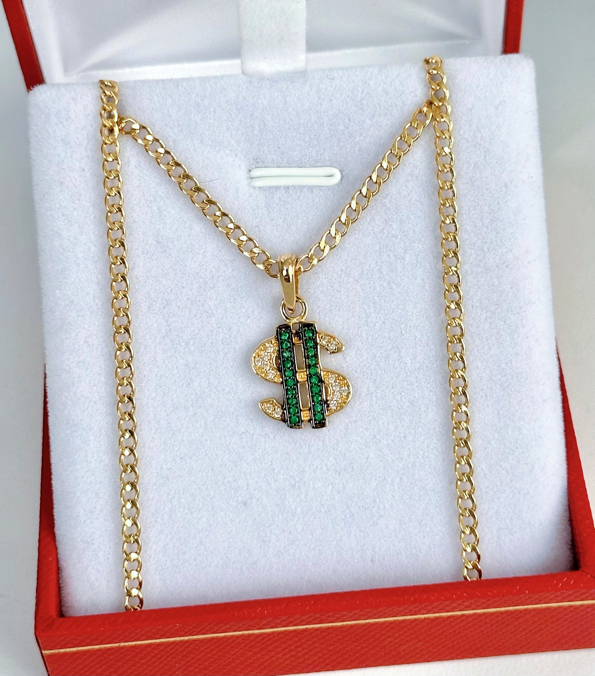 Este set incluye una cadena cubana y un dije en forma de pesos, ambos elaborados en oro de 18 quilates. La cadena cubana destaca por su diseño robusto y elegante, ideal para quienes buscan una pieza duradera y con estilo clásico. El dije en forma de pesos aporta un toque distintivo y sofisticado, perfecto para complementar cualquier look con un símbolo de valor y tradición. Este conjunto es una inversión en calidad y diseño, pensado para quienes aprecian la joyería fina y atemporal.